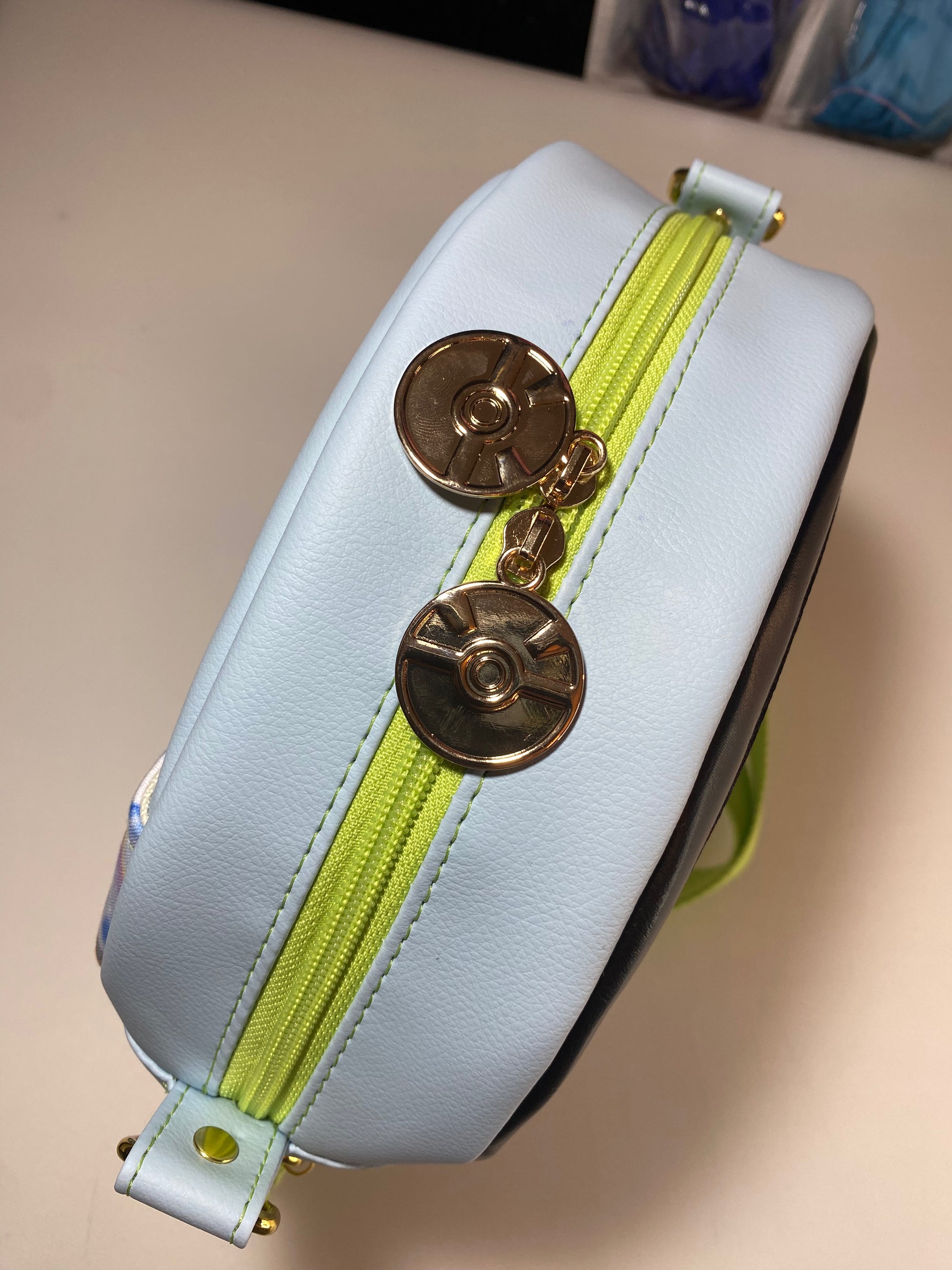 Stand out with this unique circular crossbody bag with pokeball applique stitched on the front, fun pokemon fabric on the back and custom pokeball zipper pulls. With one large slip pocket on the back and slip pocket inside this bag holds more then you would expect. Made with blue vinyl, gold hardware and Lined with waterproof canvas to keep your belongings safe and dry.